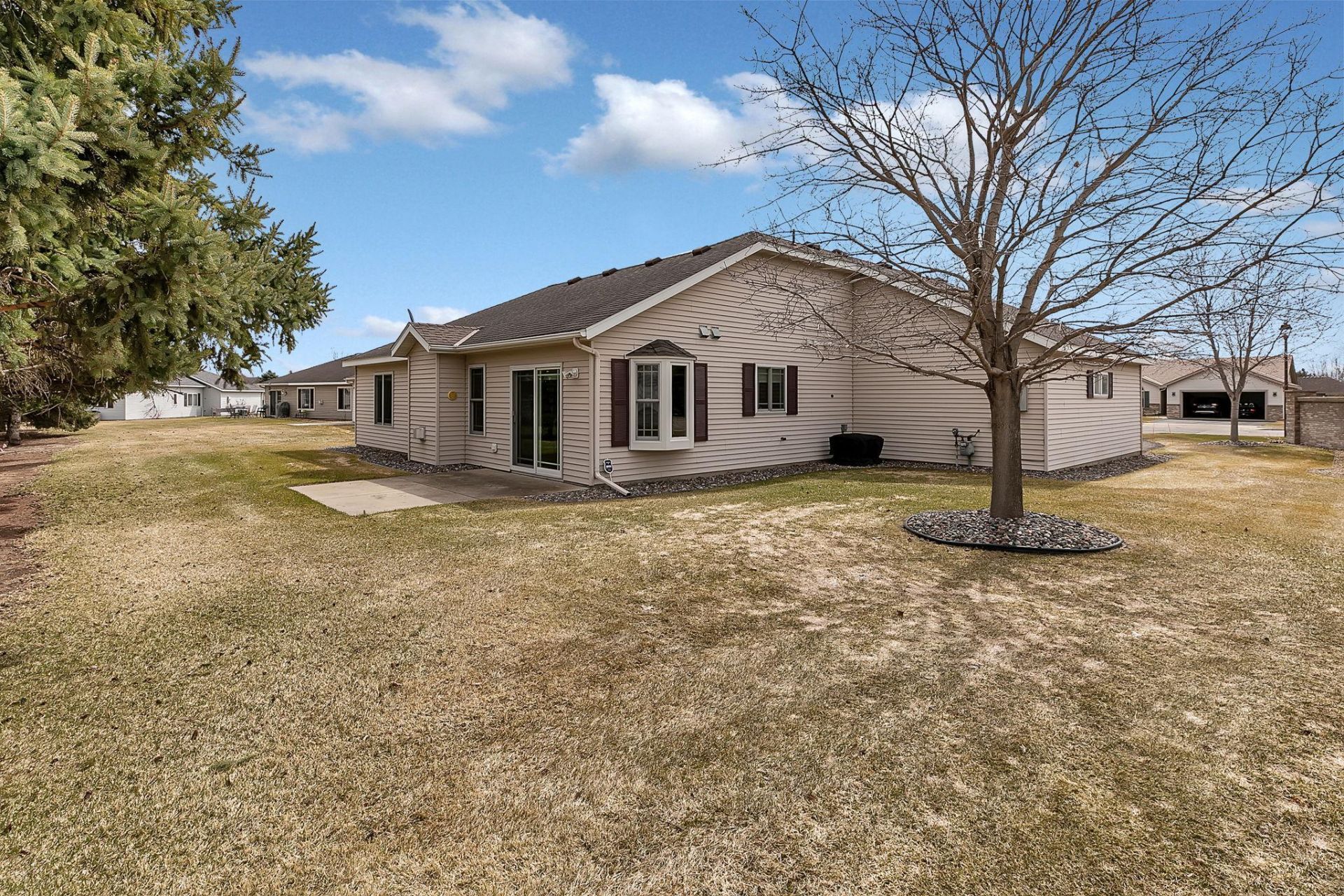 Proudly offered for the first time, this one-owner home delivers the improvements today's buyers hope for?making it truly turnkey. Recent upgrades include a newer roof, all new windows, updated flooring, and newer appliances.A standout feature of this property is the expansive yard and wide, extra-long driveway, providing ample space for guests. The rare three-stall garage offers room for vehicles, hobbies, and storage?perfect for those downsizing without sacrificing space.Step inside to an open, light-filled layout enhanced by vaulted ceilings and LVP flooring that flows through the main living areas, kitchen, dining space, and hallways, creating an inviting atmosphere for everyday living and entertaining. The kitchen features raised-panel cabinetry and a uniquely angled island that adds both function and modern style.Cozy up by the fireplace during winter months, or enjoy summer evenings on the shaded patio. The spacious owner's suite includes an oversized walk-in closet and private bath. A second bedroom is thoughtfully positioned at the front of the home and works beautifully as a den or office, with a second full bathroom nearby.Sharply priced and meticulously maintained, this home is ready for you to make it your own?schedule a showing this spring and see the value for yourself.