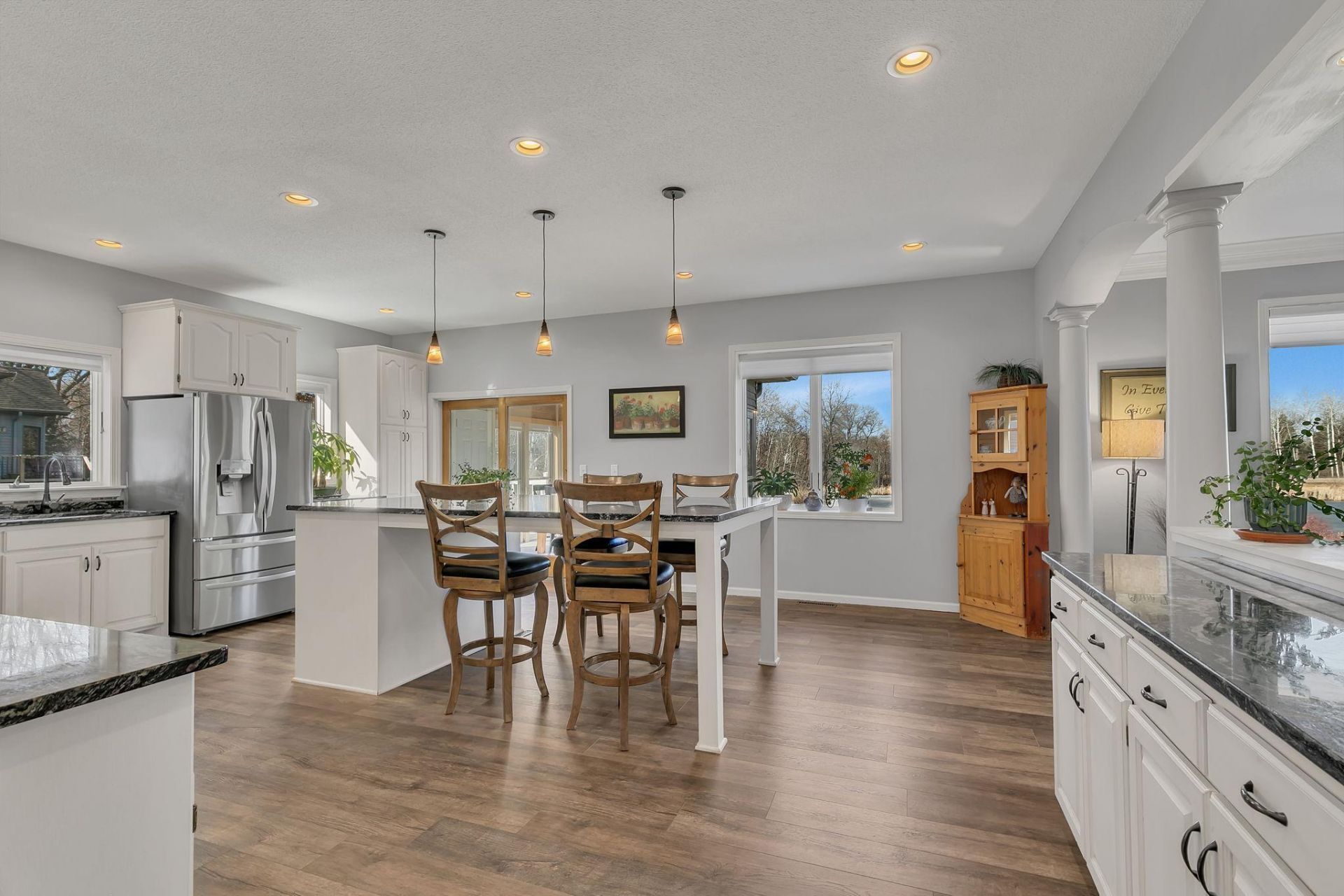 Located in the desirable Morningstar neighborhood in the heart of Sartell, this exceptional home sits on a picturesque 0.6-acre lot with a pond backdrop and convenient access to parks and walking trails. The standout kitchen features white painted cabinetry, granite countertops, tile backsplash, a new gas oven, and an oversized center island, opening to a bright three-season porch overlooking the backyard and pond. The open great room offers large windows, a gas fireplace, and new hard-surface flooring. The main level has 9 ft ceilings and includes a primary suite with a fully remodeled bathroom featuring a walk-in tile and glass shower, freestanding soaking tub, and marble-topped dual vanity, along with a second bedroom or den and a main-floor laundry. The lower level features in-floor heat, a generous family room with a second fireplace and lookout windows, and two large bedrooms, one with direct access to a walk-through bathroom with updated flooring. Major updates include roof (2021), furnace, air conditioner, whole-home water filtration system with UV light, and garage doors (2022), plus new carpet in the basement and primary bedroom (2025). An oversized heated 34x28 ft three-stall garage with shop space and a large garden shed complete the property.